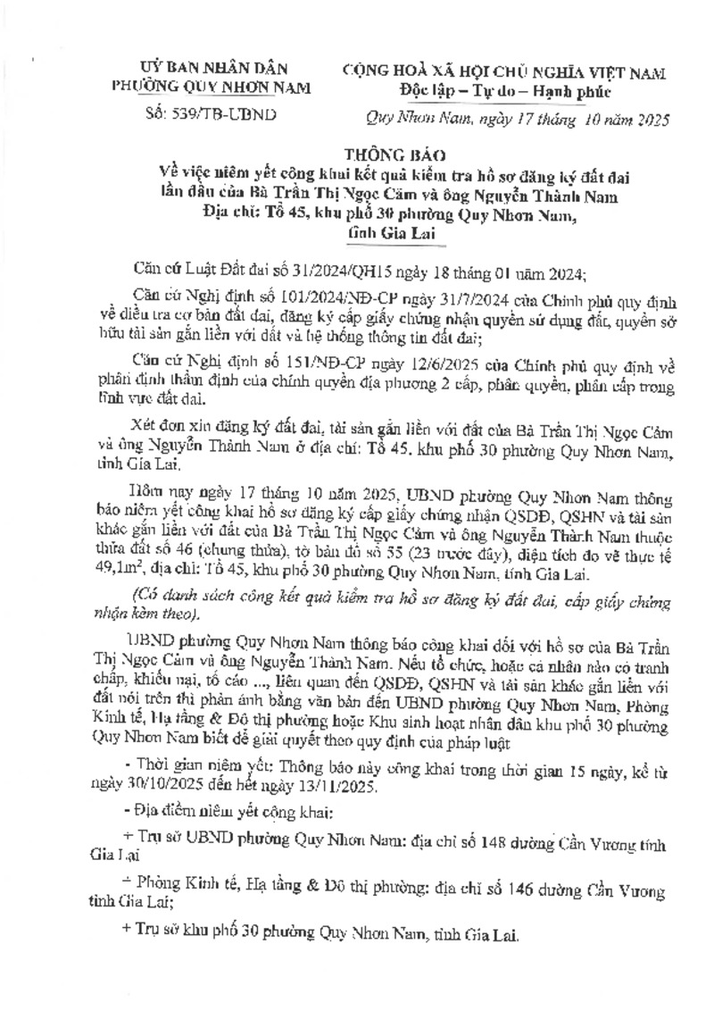 | Số hiệu | 539/TB-UBND - 17/10/2025 | Cơ quan ban hành | UBND Phường Quy Nhơn Nam |