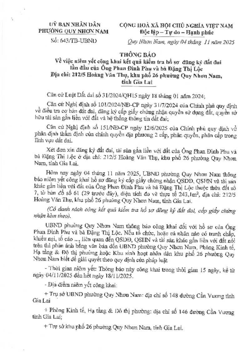 | Số hiệu | 643/TB-UBND | Cơ quan ban hành | UBND Phường Quy Nhơn Nam |