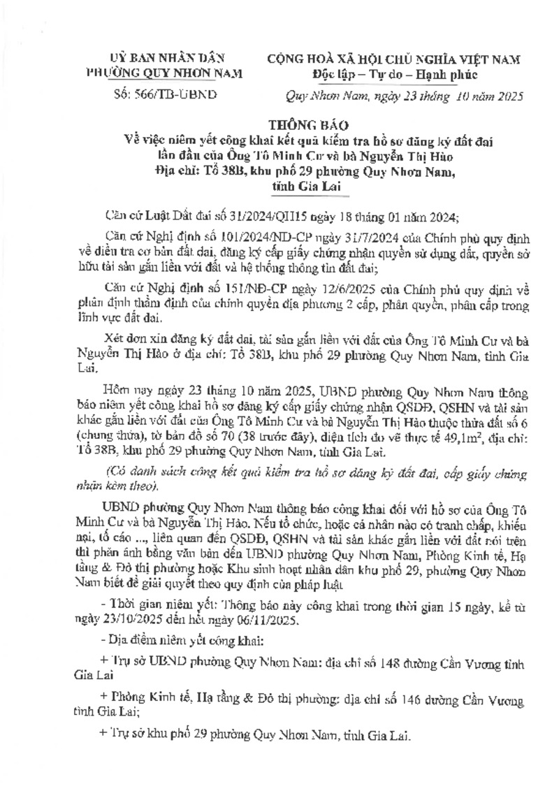 | Tiêu đề văn bản | Thông báo về việc niêm yết công khai kết quả kiểm tra hồ sơ đăng ký đất đai lần đầu của Ông Tô Minh Cư và bà Nguyễn Thị Hào Địa chỉ: Tổ 38B, khu phố 29 phường Quy Nhơn Nam, tỉnh Gia Lai | ||