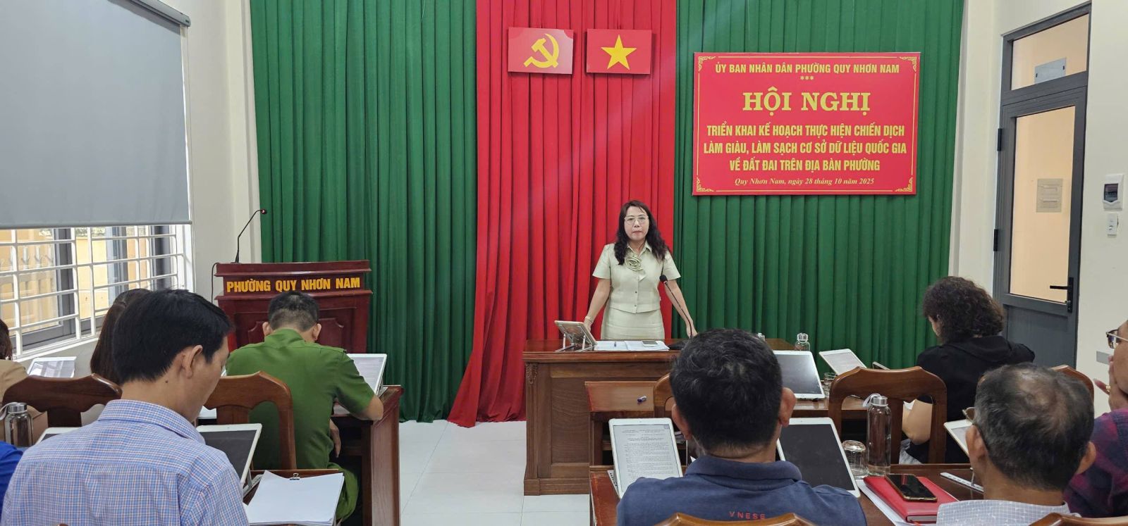 Tại Hội nghị, đại diện lãnh đạo phòng Kinh tế - Hà tầng - Đô thị phường đã phổ biến Kế hoạch số 81/KH-UBND ngày 20/10/2025 của UBND phường triển khai Chiến dịch “Làm giàu, làm sạch Cơ sở dữ liệu đất đai” nhằm hoàn thiện, đồng bộ và số hóa dữ liệu đất đai trên toàn địa bàn, trong đó chú trọng những nội dung trọng tâm cần thực hiện, cách tham gia và trách nhiệm của người dân, những nội dung người dân cần chuẩn bị; công tác thu thập thông tin (các nhóm thông tin về thửa đất; người sử dụng đất ở, chủ sở hữu tài sản gắn liền với đất; tài sản gắn liền với đất; Giấy chứng nhận); thu thập Giấy chứng nhận, thẻ CCCD; tổng hợp số liệu, quét (scan)/Chụp Giấy chứng nhận, thẻ CCCD và xử lý theo quy định về dữ liệu đất đai; cách nhập thông tin vào biểu mẫu sau khi Giấy chứng nhận đất ở, nhà ở, thẻ CCCD đã được thu thập, số hóa…