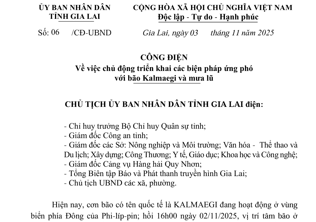 l) Sở Văn hóa, Thể thao và Du lịch: Chỉ đạo Báo và Phát thanh, truyền hình Gia Lai, các cơ quan thông tin đại chúng tăng cường thông tin, tuyên truyền liên tục về diễn biến của bão, mưa lớn đến các cấp chính quyền, chủ phương tiện hoạt động trên biển và Nhân dân để chủ động phòng tránh. Cụ thể: Ngày 03/11 phát tối thiểu 02 lần/ngày; từ ngày 04/11 trở đi, phát liên tục ngay khi có bản tin dự báo, cảnh báo mới. Phối hợp Sở Khoa học và Công nghệ, tăng cường phát tin bão, lũ trên Hệ thống quản lý thông tin nguồn.
