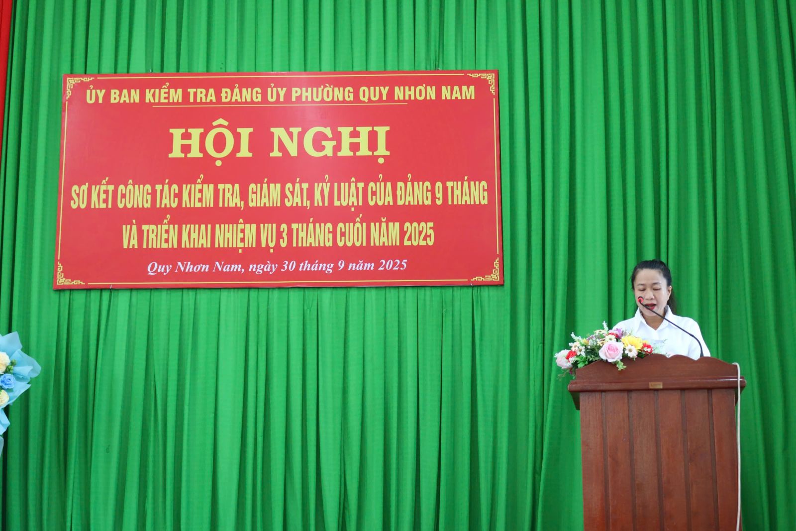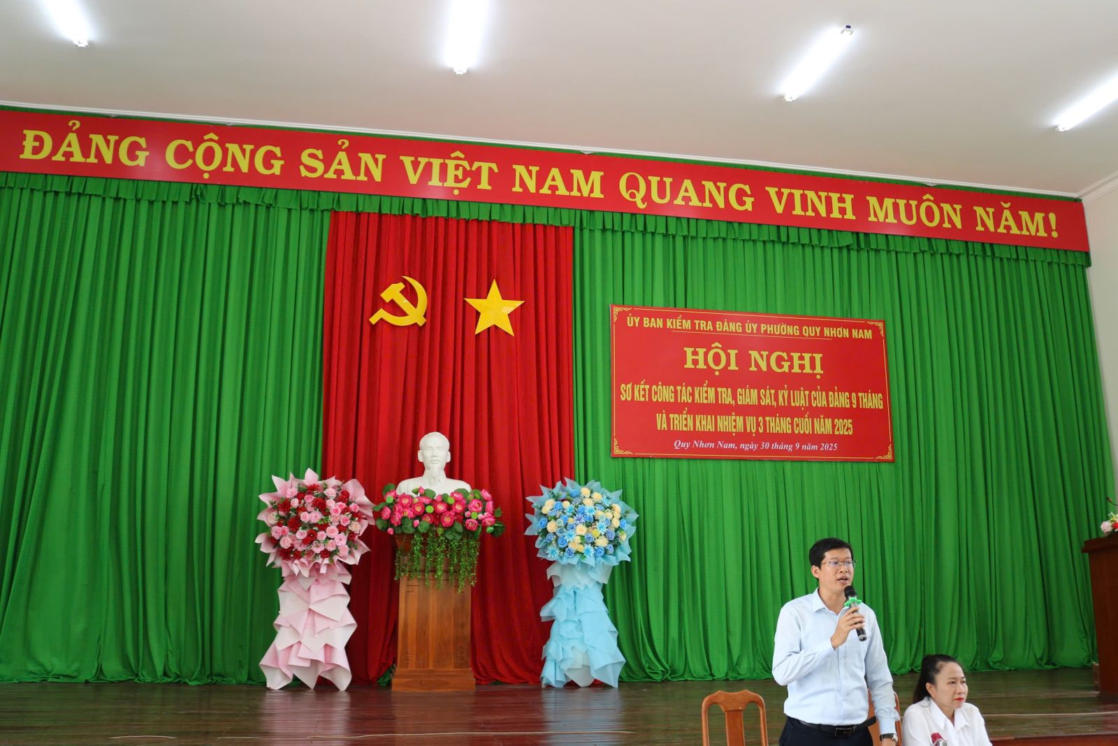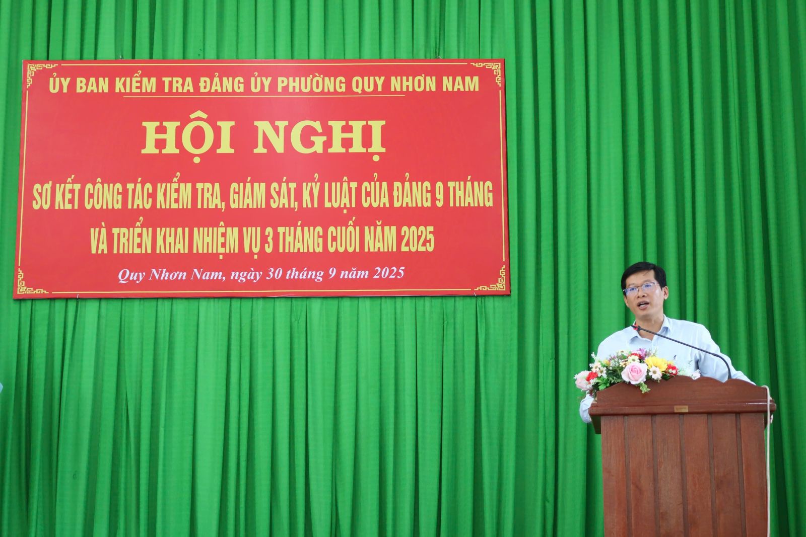 Sáng ngày 30/9/2025, tại Hội trường Đảng ủy phường Quy Nhơn Nam, Ủy ban Kiểm tra Đảng ủy phường đã tổ chức Hội nghị sơ kết công tác kiểm tra, giám sát, kỷ luật của Đảng 9 tháng và triển khai nhiệm vụ 3 tháng cuối năm 2025. Chủ trì Hội nghị: đồng chí Thái Văn Nam - Ủy viên Ban Thường vụ Đảng ủy, Chủ nhiệm Ủy ban Kiểm tra Đảng ủy vả đồng chí Nguyễn Thị Hải Yến - Đảng ủy viên, Phó Chủ nhiệm Ủy ban Kiểm tra Đảng ủy. Tham dự Hội nghị có các đồng chí: Ủy viên Ủy ban Kiểm tra Đảng ủy; Bí thư, Phó Bí thư các đảng bộ, chi bộ trực thuộc Đảng ủy phường và Chủ nhiệm, Phó Chủ nhiệm Ủy ban Kiểm tra Đảng ủy cơ sở.