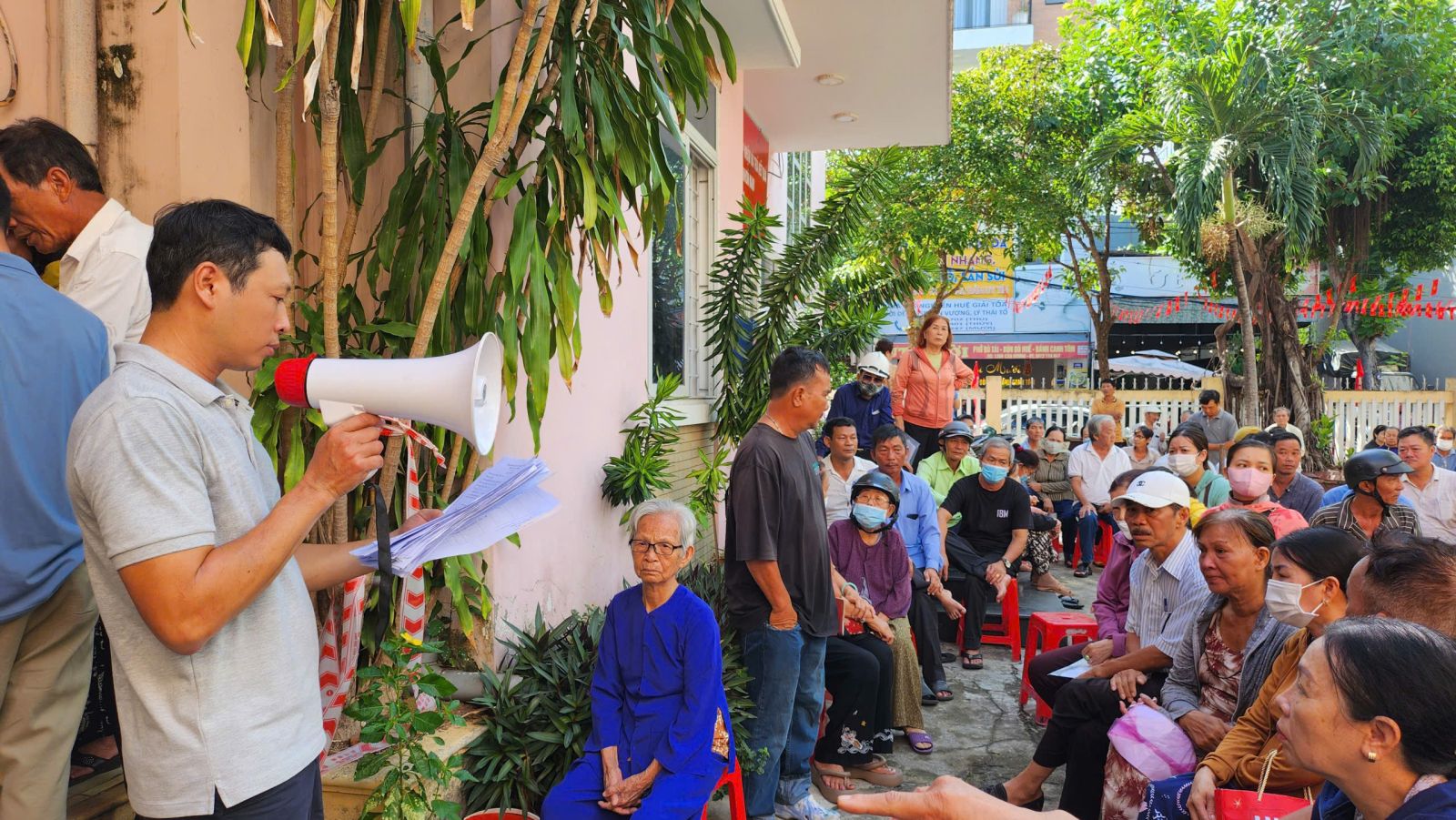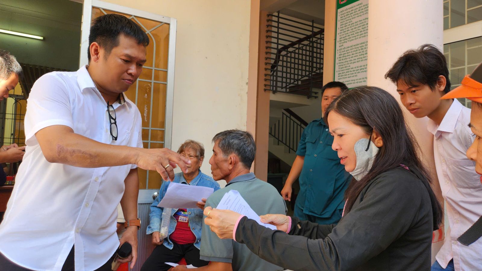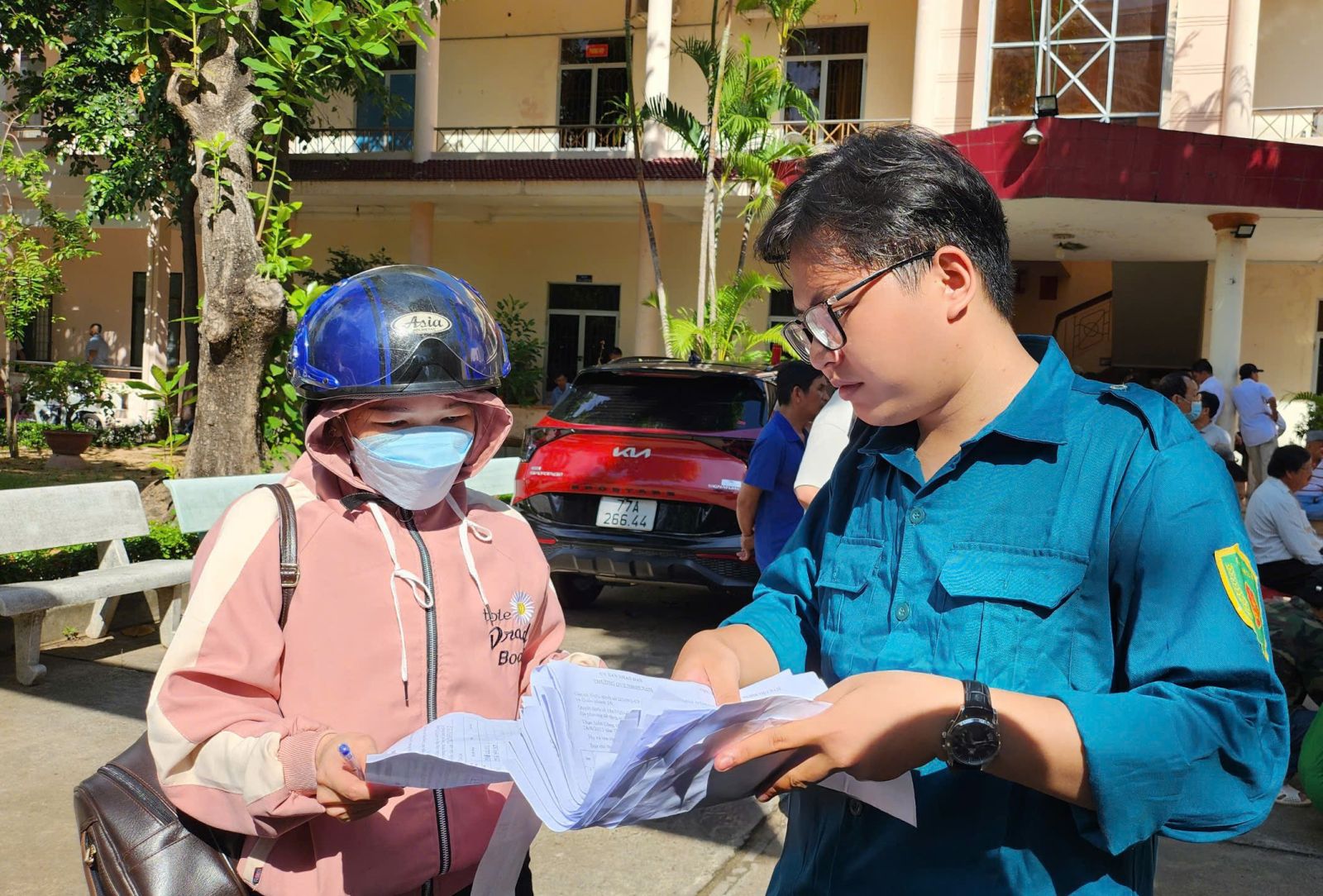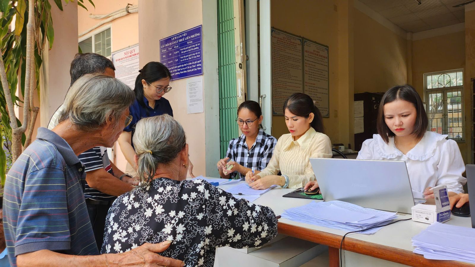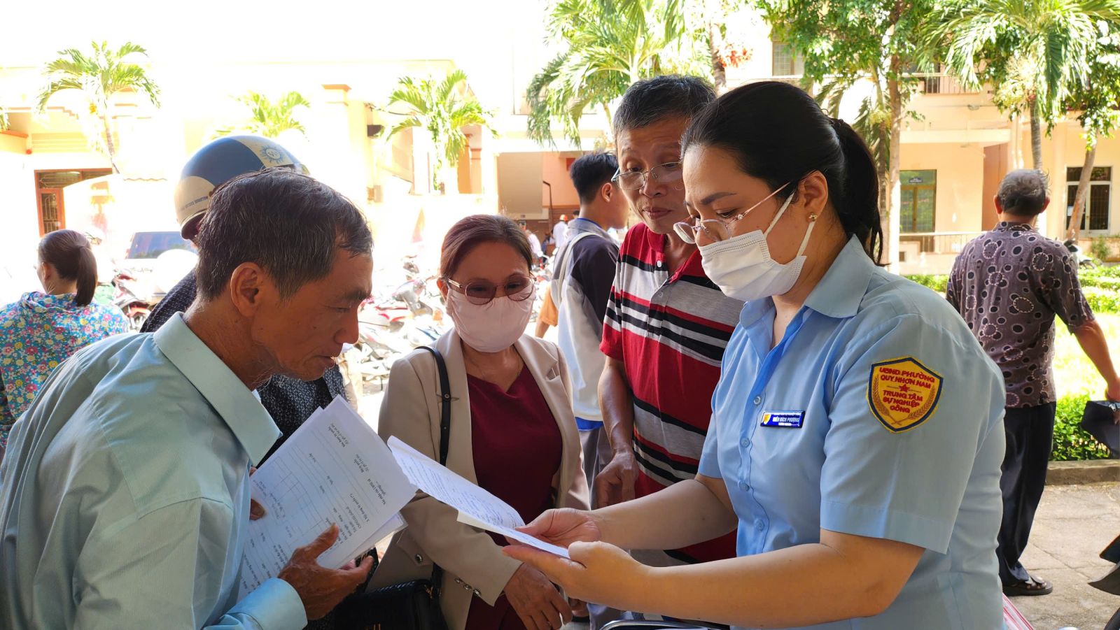 Cán bộ phường Quy Nhơn Nam hướng dẫn cho người dân thực hiện các quy trình cần thiết để nhận quà.